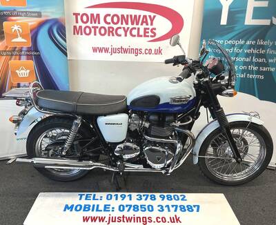 It has been garaged and looks as it it has never seen a wet road and been polished more than ridden. You will struggle to find a cleaner example and it is fitted with a few quality extras including Oxford heated grips, a rear carrier, chrome crash bars and a fly screen. This bike has the looks of an original 1960's T100 and comes complete with the Triumph document holder, certificate of authenticity, owners manual, service book and spare key. We can offer usual dealer facilities including part exchange, 12 months extended Warranty First warranties and finance packages. Please call 0191 3789802 shop or 07850 317887 mobile or email Tom@justwings.co.uk for more details or a finance quotation. £5495